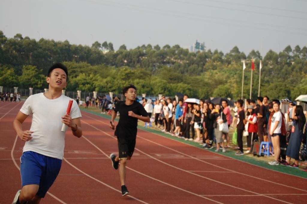 下午的赛事同样激烈,特别是1500米长跑项目及4×10米接力赛,竞争尤为激烈。在一阵阵呐喊声中,长跑运动员们备受鼓舞,在将近四圈的赛程里你追我赶,拼尽体力和意志,为班级和自己拼搏着。其后最富观赏性的接力赛中更是传来激昂的加油助威声,“加油!加油!”观众的助威声盖过了运动员的呐喊,运动会的气氛更是高涨起来。